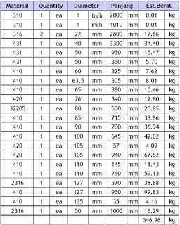 Material | Quantity | Diameter | Panjang | Est.Berat | ||||